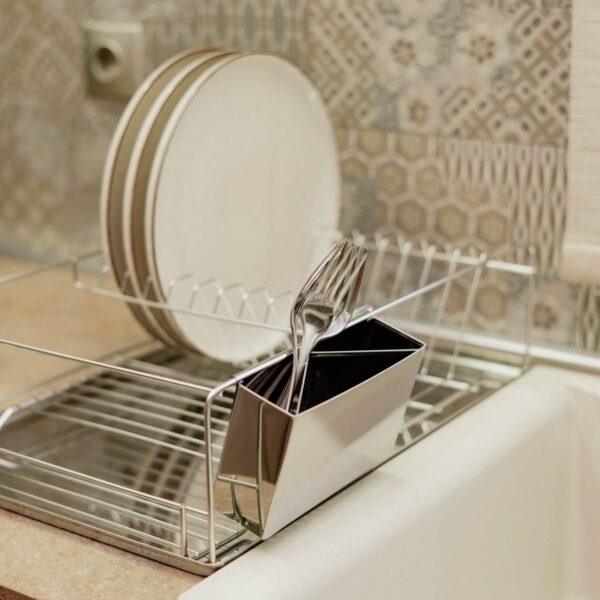 Κομψή και πρακτική μεταλλική πιατοθήκη με πλαστικό δίσκο συλλογής νερού και ξεχωριστή θήκη για μαχαιροπήρουνα.Ιδανική για κάθε κουζίνα, προσφέρει ευκολία